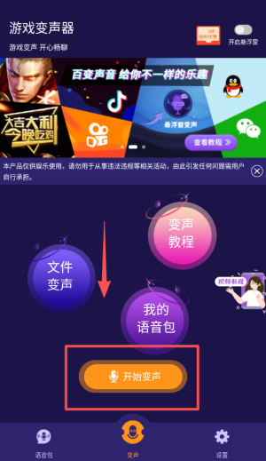 2、返回首页点击开始变声,可开启悬浮窗变声方便在游戏中随时切换声音效果。