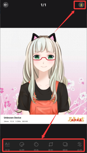 4、然后使用下面的菜单工具编辑图片然后选择右上角的下载按钮保存。
