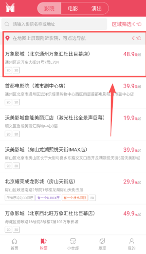 4、在影院页面可按区域筛选或地图查找附近影院,查看票价与特色影厅信息并导航前往。