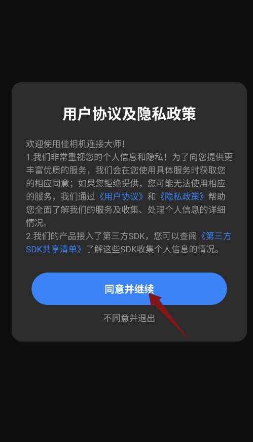 1、启动应用需单击同意协议并继续,方可进入功能主界面。