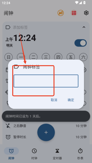 3、为每个闹钟输入明确的命名,例如“吃药”、“会议”,以便提醒时能清晰了解事项。