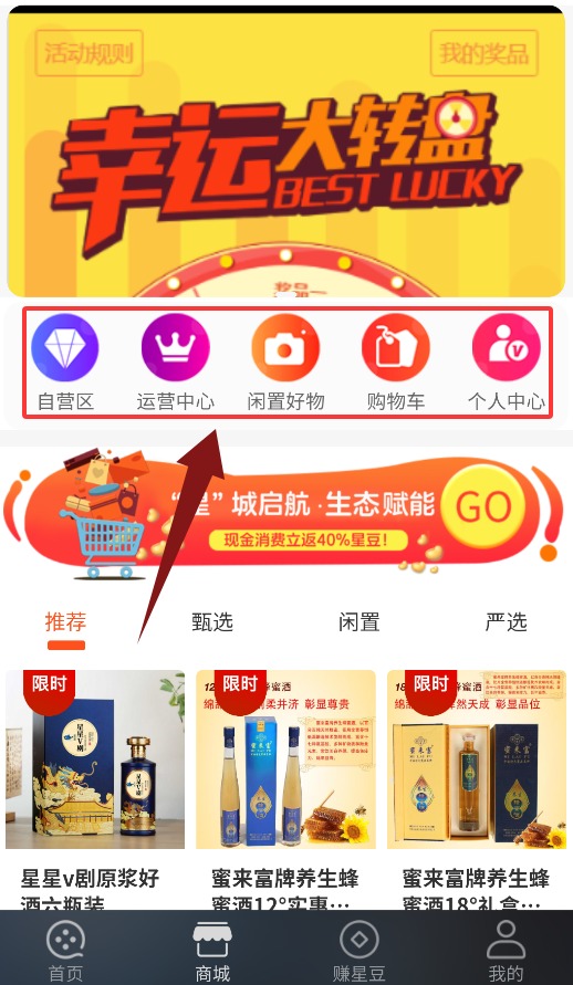 3、商城界面提供专营区、运营专享、闲置好物与购物车功能。