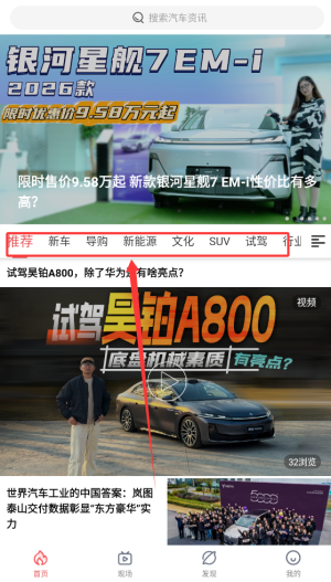 3、首页提供新车资讯、导购推荐、新能源动态、汽车文化、SUV车型及试驾体验等内容。