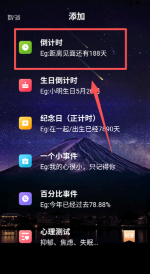 3、选择一个倒计时事件,输入日期和单位等等,然后设置背景,点击完成即可。