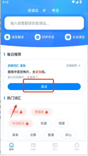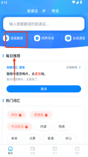 1、下载并打开粤语翻译帮app,在主界面选择“学习”或“翻译”核心功能入口。