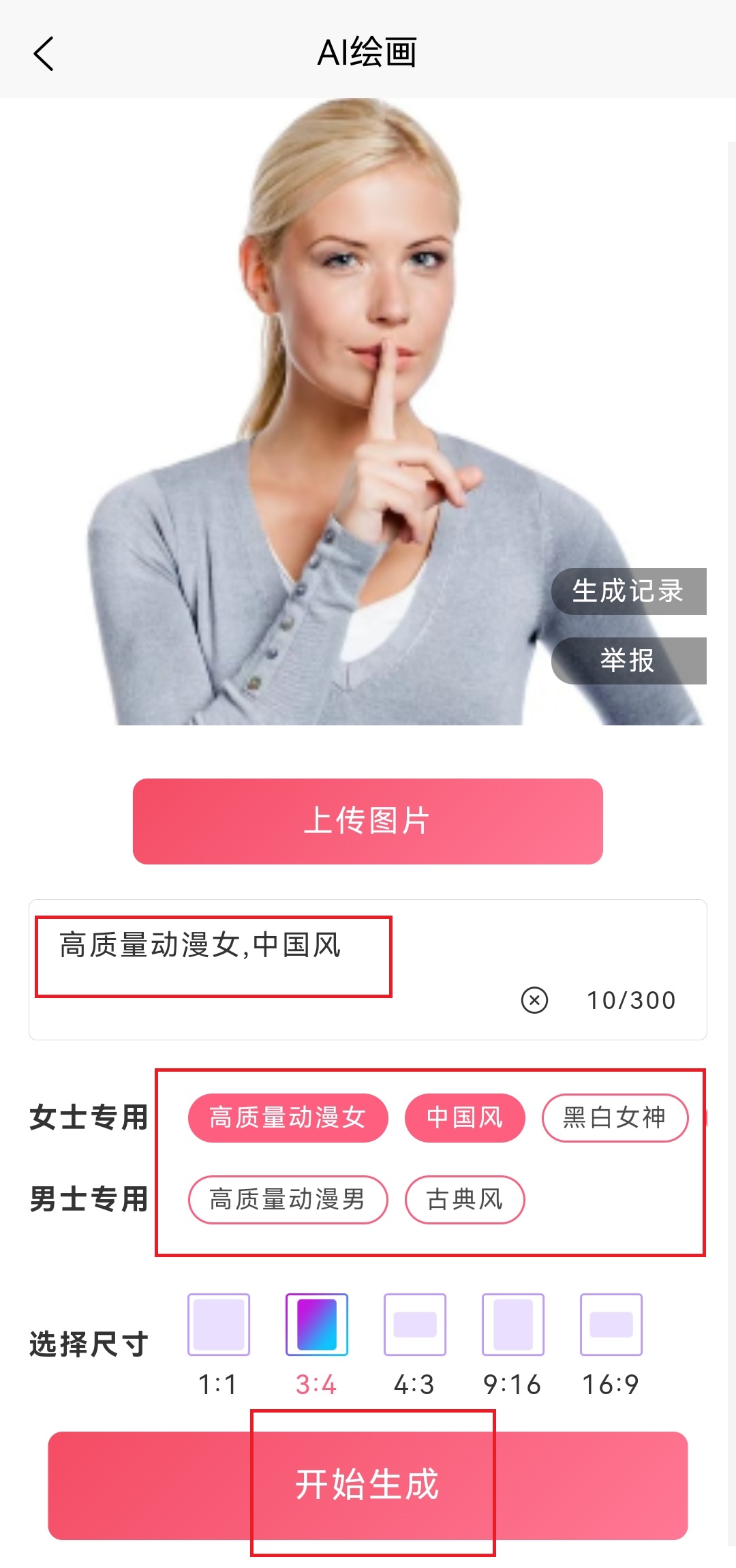 2、进入之后首上传图片,选择喜欢的风格或者自己输入,选择需要的尺寸。