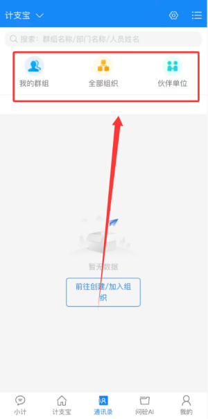 3、通讯录板块提供我的群组管理、全部组织结构查询及合作伙伴单位信息浏览功能。