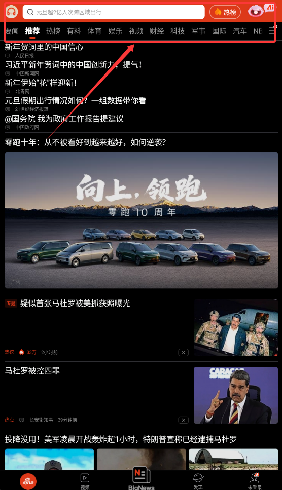 2、下方有一排推荐、热点这样的标签,点击就能切换到不同的资讯分类啦。