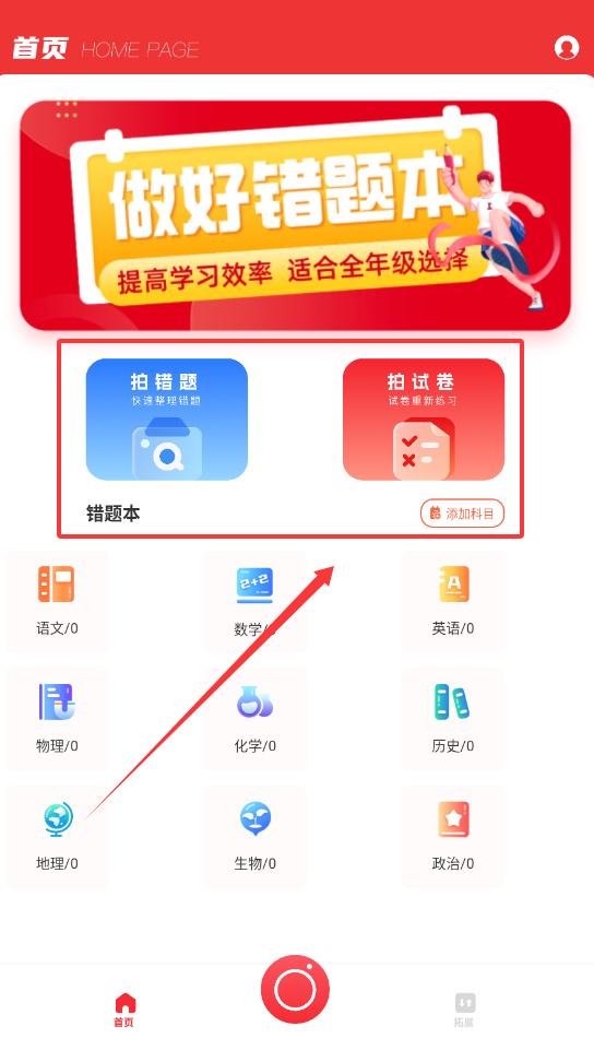 1、打开软件进入首页,能看到醒目的“做好错题本”横幅,下面有“拍错题”和“拍试卷”两个主要按钮。