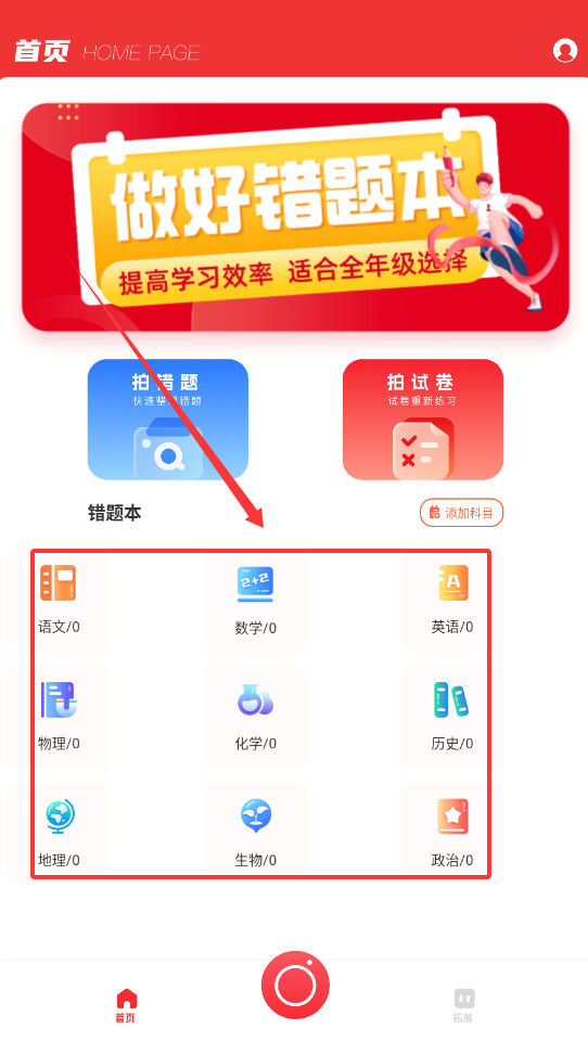 3、拍完错题或试卷后,软件会自动帮你按科目整理好,你可以随时查看各科错题数量,复习起来很方便呢。