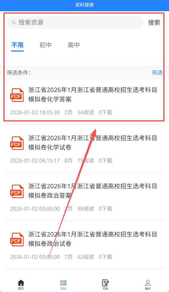 2、在资料内可以进行搜索需要的资源,可以查看初中或者高中等考试信息。