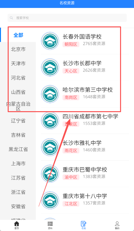 3、可以在名校栏内选择查看各地的学校信息,选择自己心仪的学校。