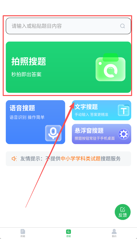 3、可以在搜题页面选择直接搜索题目内容,也可以选择拍照搜题。