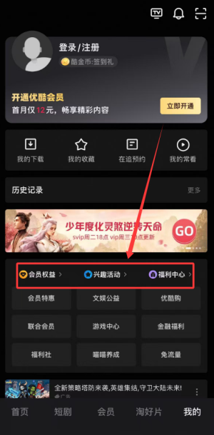 4、同时展示会员专属权益、兴趣相关活动参与入口及福利中心积分兑换等服务。