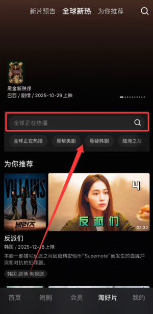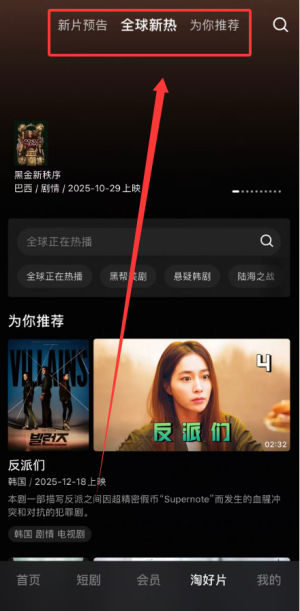 1、淘好片板块提供新片预告信息、全球热映榜单及个性化内容推荐等功能。