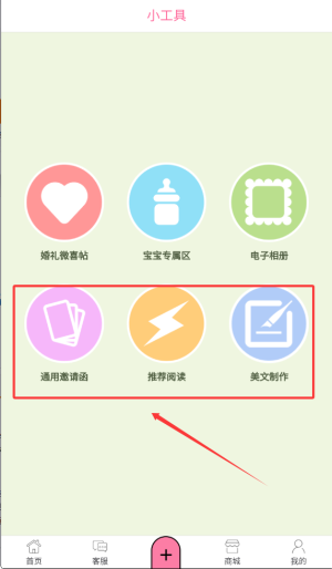 4、点击加号可创建通用邀请函,并浏览推荐阅读内容或使用美文编辑工具制作个性化文案。