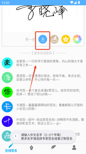 酷签签名设计app是款专业实用的签名工具,软件使用起来十分简单;各种超棒的字帖,轻松临摹,高清的视频教学,专业的步骤选择,别出心裁的各种签名样式,相当实用的功能!还有专家在线为你设计签名,你还在等什么?快来下载吧!