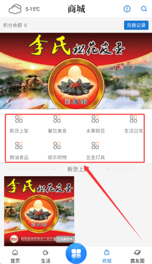 4、商城板块展示新品上架、餐饮美食、水果鲜花及粮油食品等商品信息。