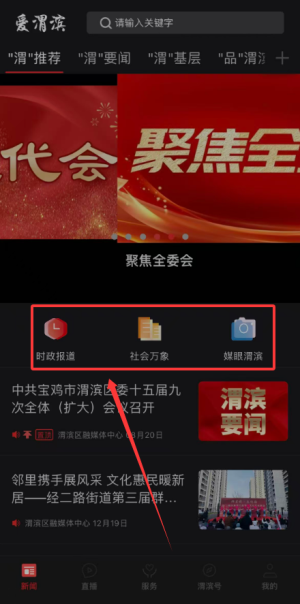3、首页提供时政报道浏览、社会万象资讯及媒眼渭滨等本地化内容展示入口。