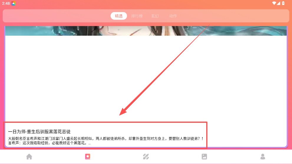 3、找小说可以看看精选或排行榜标签,滑动浏览简介找到感兴趣的点开阅读哦。