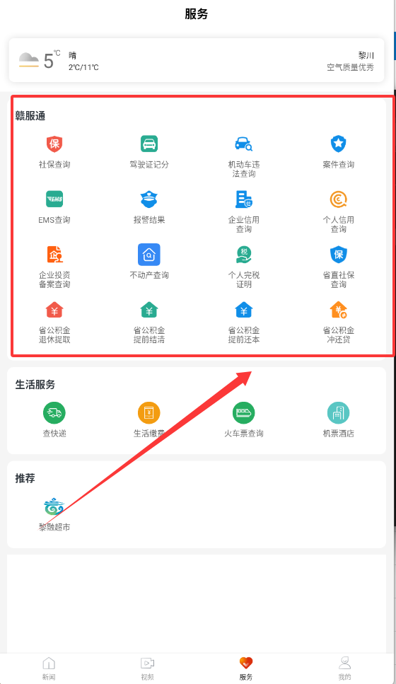 3、需要办事,可以到“服务”页的赣服通区域,查社保、缴费这些生活服务都能搞定。