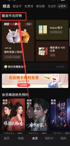 1、会员板块支持使用酷金币兑换各类实物或虚拟礼品,丰富会员专属福利内容。