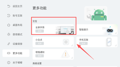 4、更多功能里可设置交互方式,如开启全屏手势或小白点,也能管理通知增强和手机互联等高级选项。