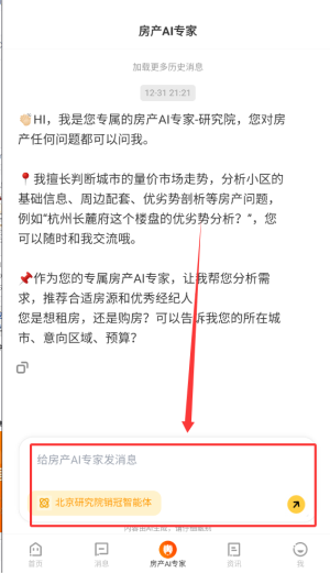 4、房产AI专家功能支持用户直接发送消息,获取智能问答或个性化咨询服务。