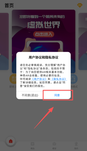 1、首次打开软件后仔细阅读用户协议和隐私协议点击同意按钮即可进入虚拟世界。