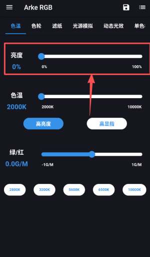 2、调整亮度时直接滑动0至100的百分比滑块。色温部分提供了从2000K到10000K的预设值,也可手动精确设定。
