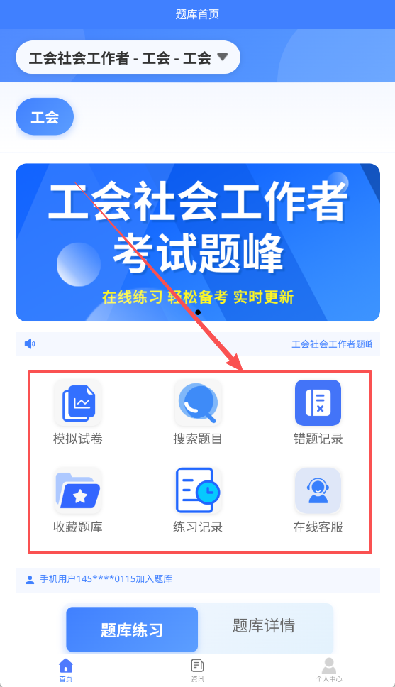 1、打开软件进入题库首页,找到工会社会工作者这个选项点击进去吧。