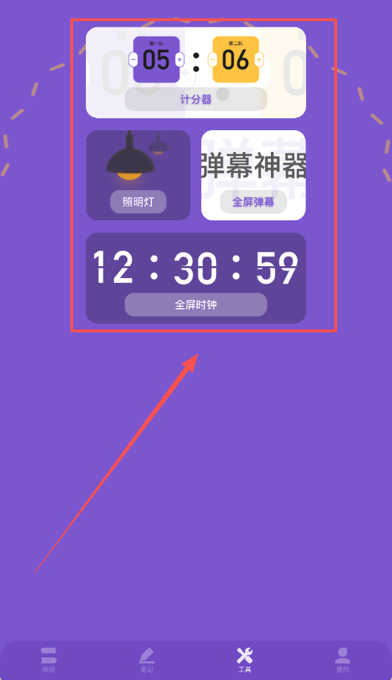 4、切换到工具页面,那里有计分器全屏时钟等好多实用小组件,选择喜欢的就能直接设置到手机桌面上,很方便呢。