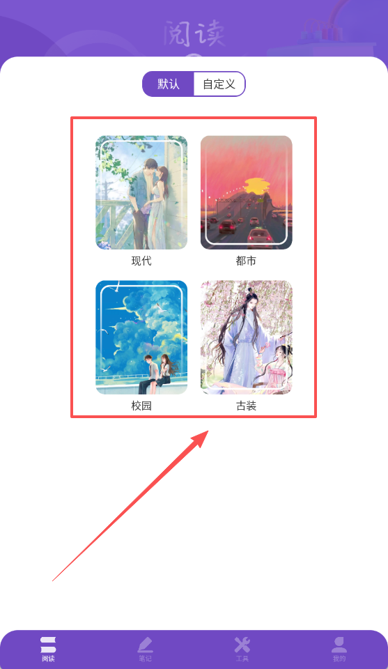 1、在主界面选择自定义阅读,可以见到现代都市等不同场景的精美背景主题,根据自己的喜好点击切换就好啦。