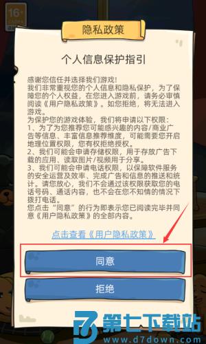 1、点击同意按钮,确认隐私政策开始游戏。