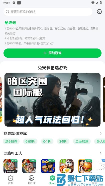 1、首先下载安装之后打开,在导航栏下可以看到免ROOT,点击即可进行游戏修改。