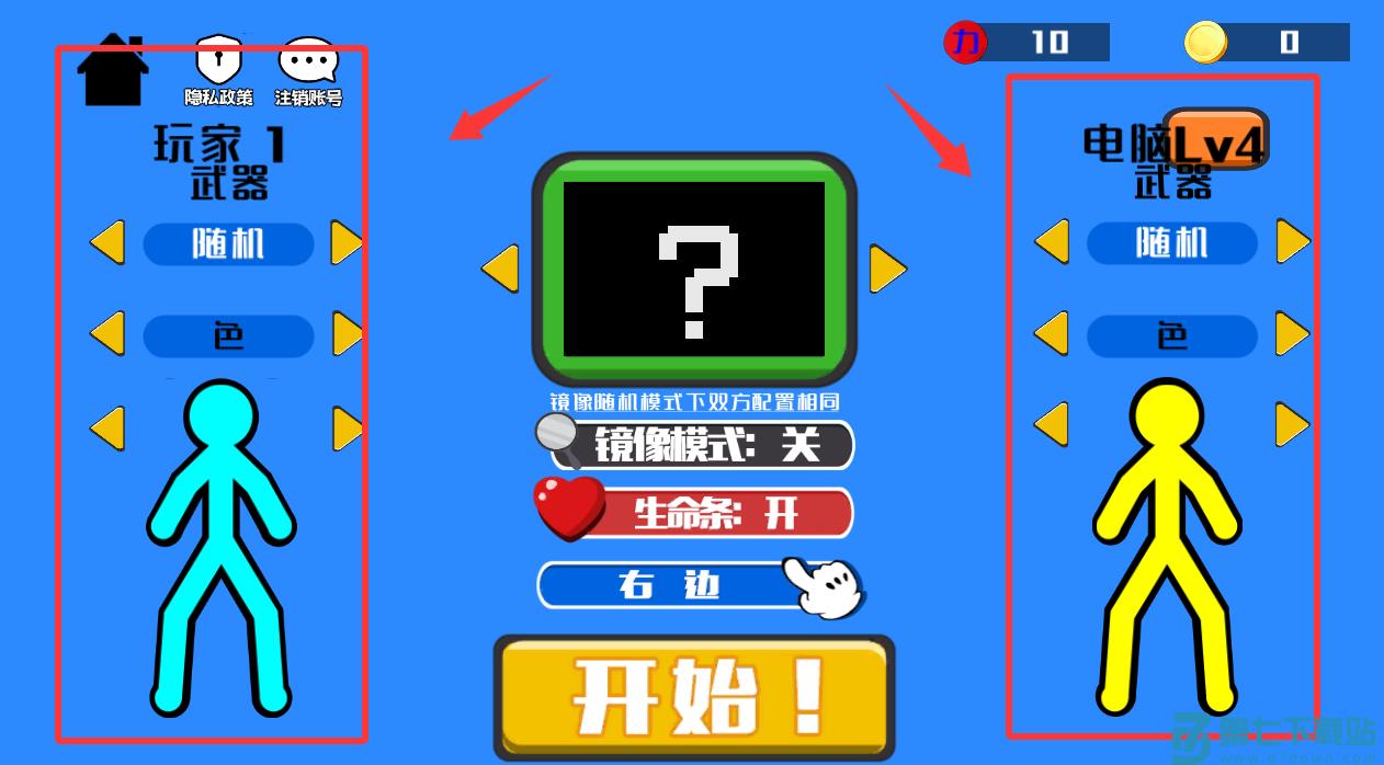 3、左边红色框框是玩家,右边是电脑人机,可以调节颜色武器。
