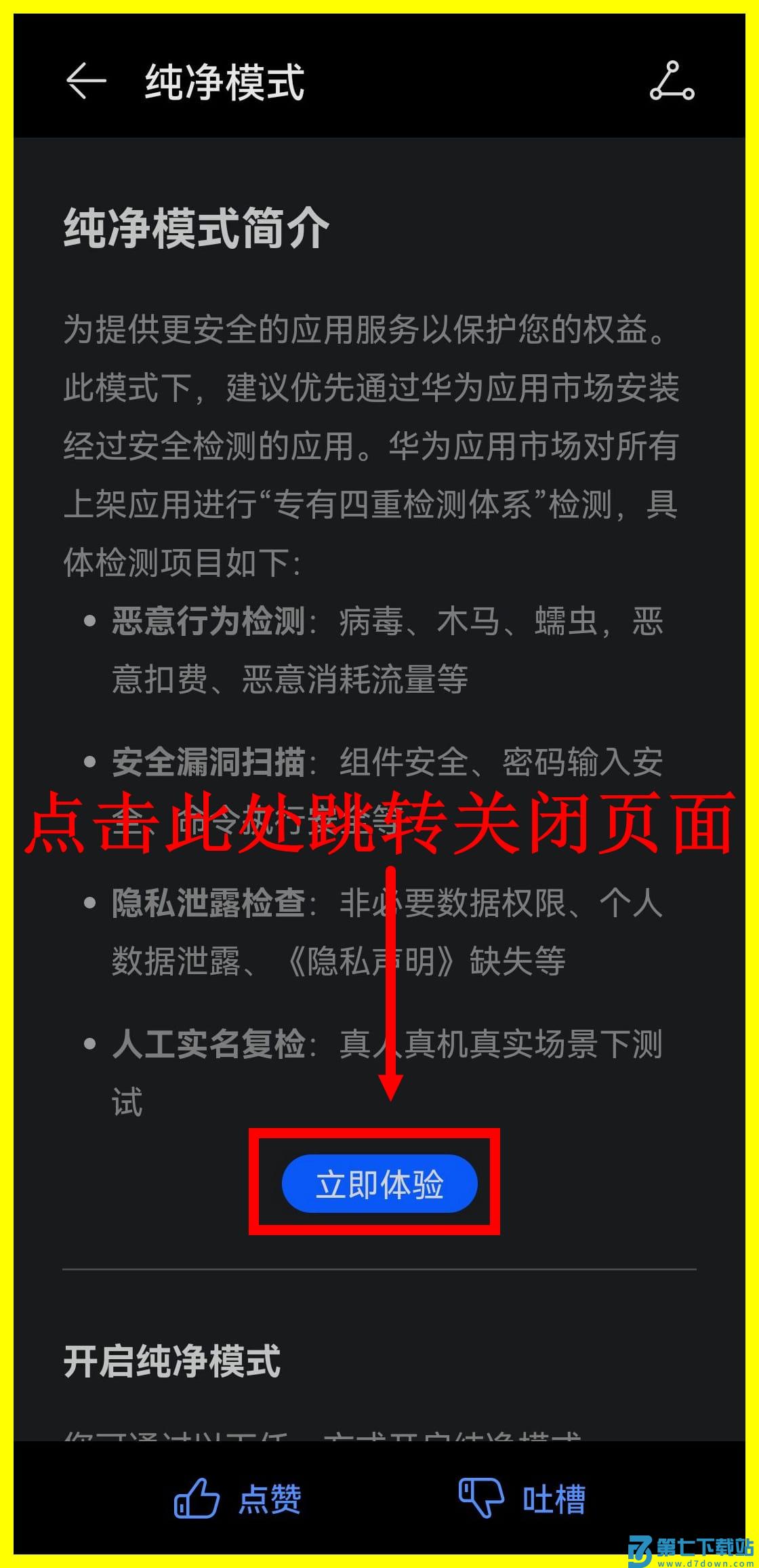 2.此处为纯净模式介绍,点击下方(立即体验)跳转关闭页。