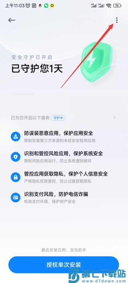 3.进入安全守护菜单后,可以选择授权单次安装,不过这样每次都要输入密码,也可以点击右上角的三个小点