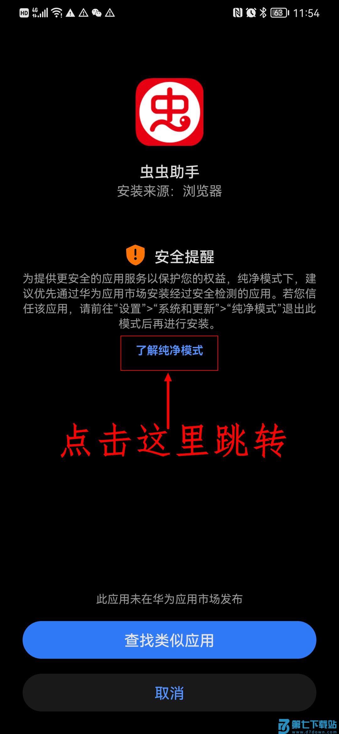 下载好虫虫助手,点开安装页面提示无法安装,点击(了解纯净模式)。