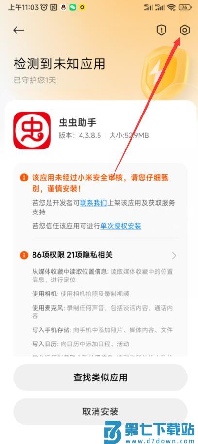 1.在安装应用时,如果弹出检查到未知应用,可以点击右上角的设置