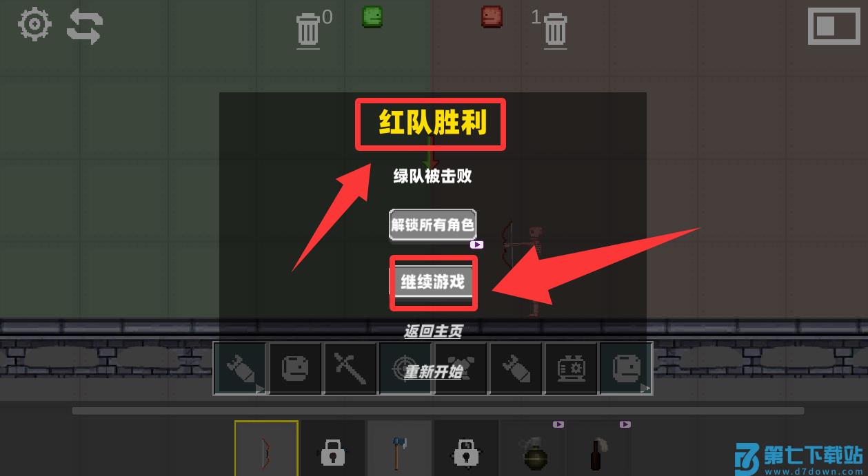 2、恭喜你红队胜利了,点击红色框框里继续游戏。