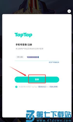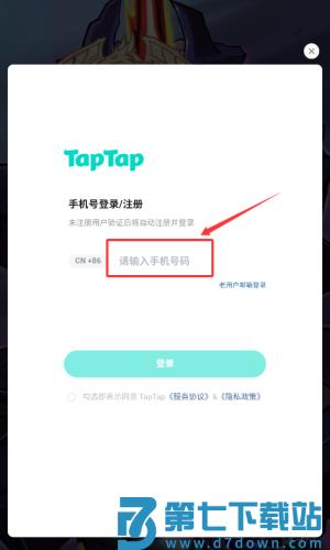 2、在输入框填写手机号码,点击红框箭头指向的登录按钮。