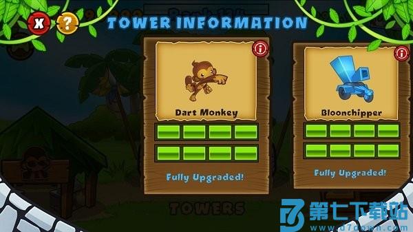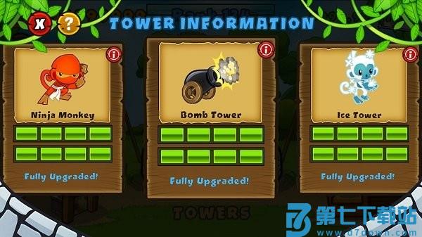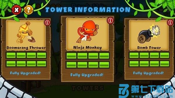 狙击手猴全屏幕射程,射速慢,初始每枪穿透两层气球,建议点击后选择“strong”攻击模式。