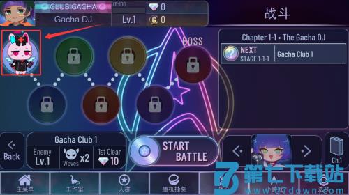2、在战斗准备页点击红框标注的START按钮,开始第一章挑战。