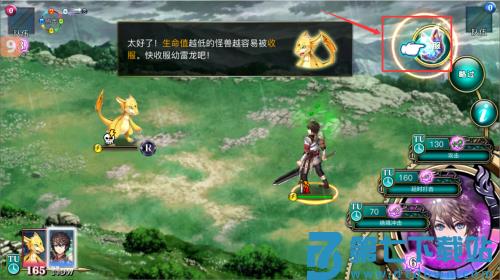2、根据红框提示,对生命值低的怪兽使用收服功能。