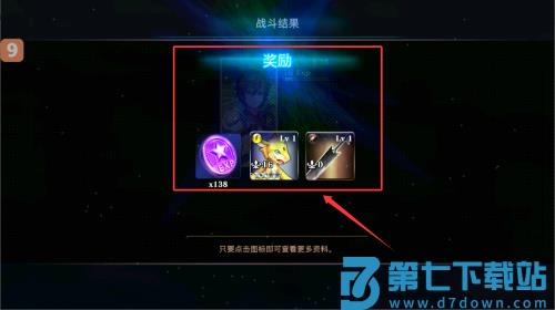 3、点击红框标注的奖励图标,查看战斗获得的道具详情。