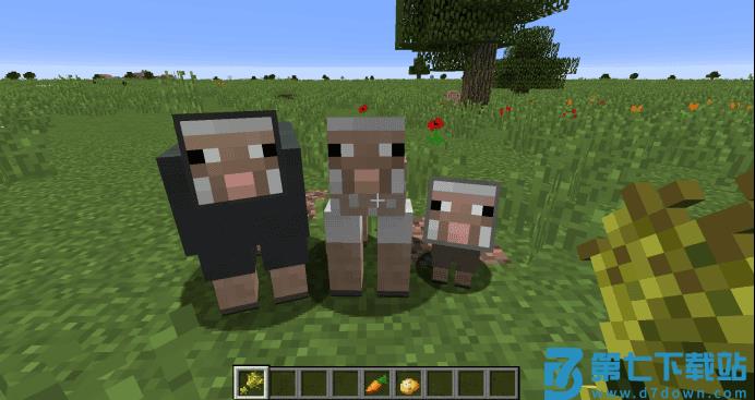 在树下自然生成的白色与黑色的羊,其旁边也生成了一只猪