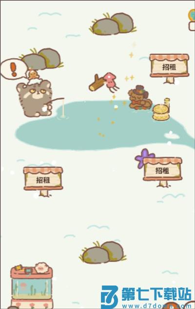 鱼塘布置:渔夫兔丁、6个摊位、鱼塘贩卖机、鱼塘。