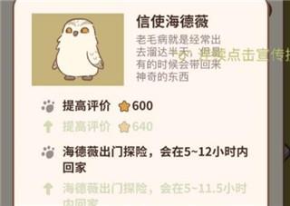 通过种花许愿,把所得的物品放进海德威的行李箱里,带回来的可能有信件也可能有水壶、星星,不放物品放箱子里,空飞也可能带回小鱼干和星星,具体看运气,多升级海德威的属性,降低海德威每次飞行时间,满级后应该是4-8小时飞回来哦!