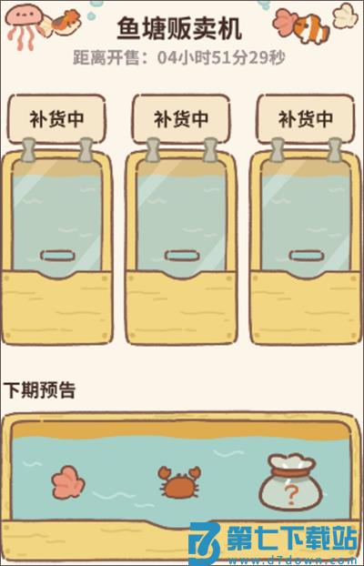 贩卖机玩法:鱼塘贩卖机会在3个时间点开放,分别是.上午8点到10点、中午12点到下午2点、下午7点到夜晚9点,贩卖机中一共有3个柜子,到时间就会有3种鱼进行售卖,这时候就要用鱼饵购买,购买的鱼种类不同所需的鱼饵数量不同。